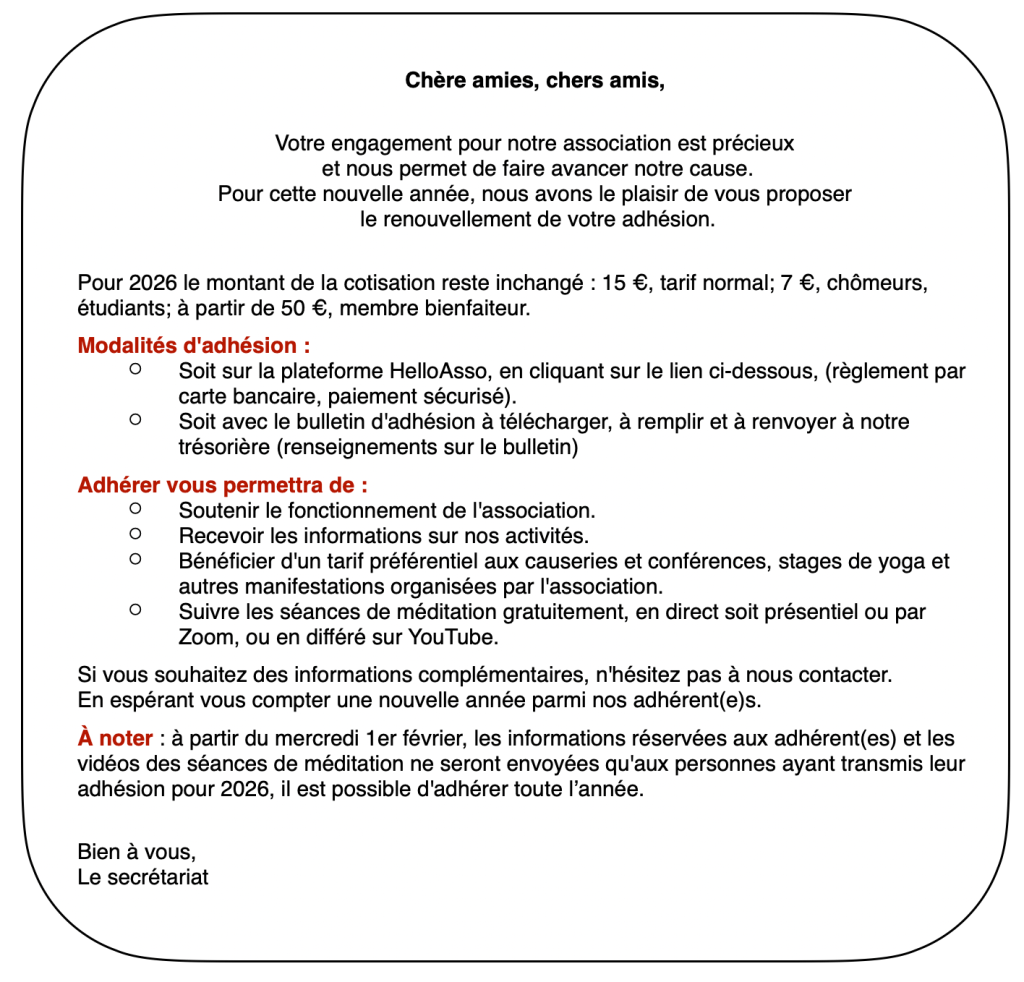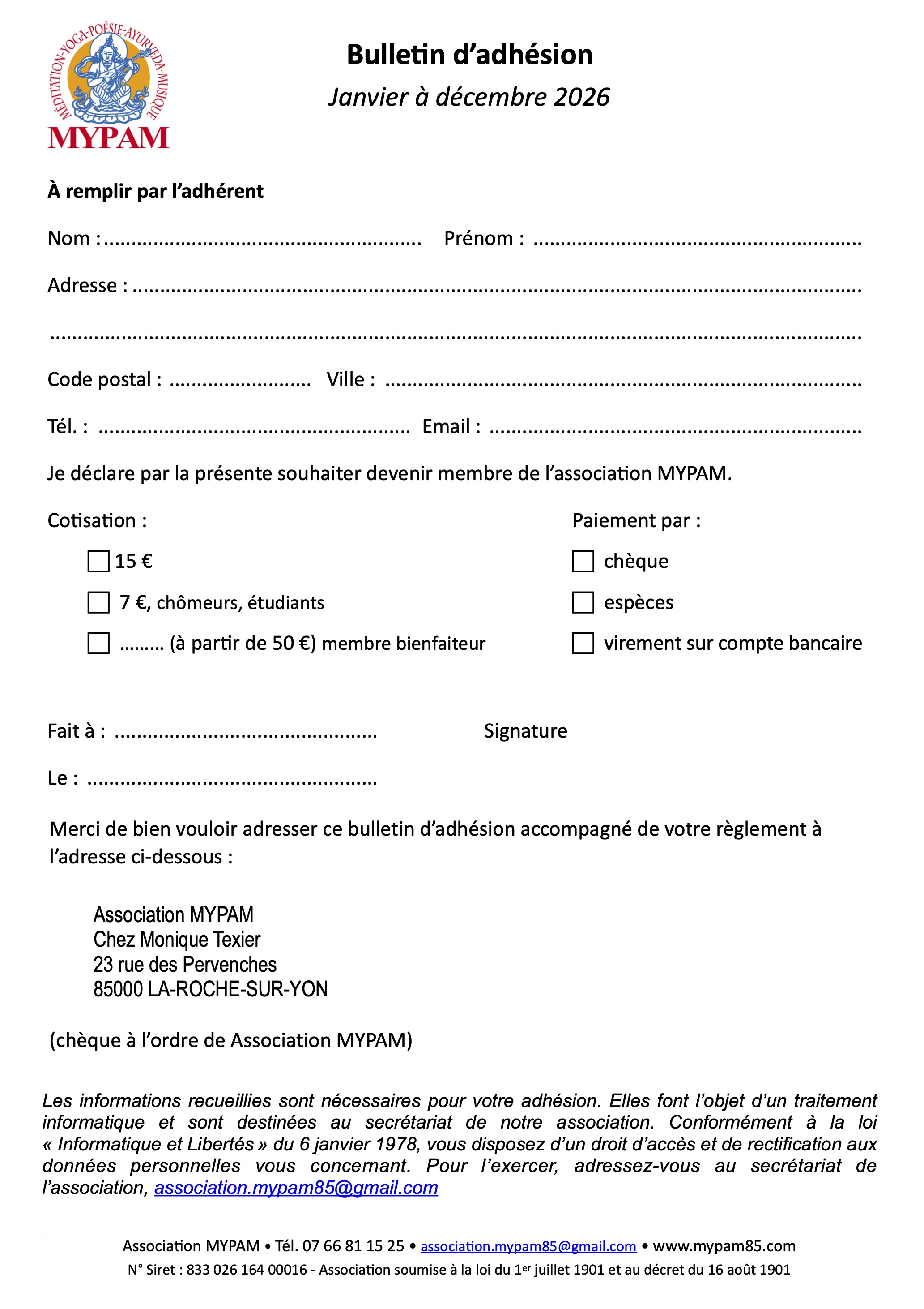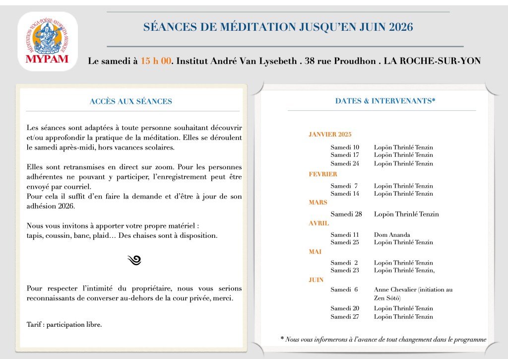 En tant qu’Association Culturelle (Loi 1901) et pour réaliser son objet, l’Association Mypam organise : des sessions de méditation, des stages de yoga, des retraites de méditation (avec des ateliers yoga, ayurvéda, qi gong, ou haïku…), des causeries et conférences, des concerts, des lectures…